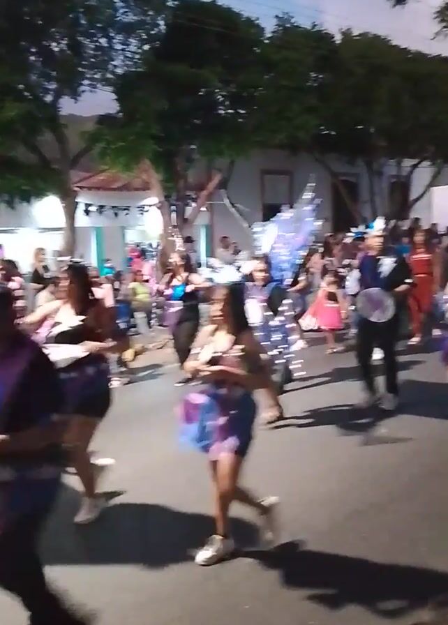 procession of people moving along a street, likely during a parade or festival. The individuals are mostly young, possibly children or teenagers, and appear to be associated with a school group or community organization. They are dressed in a variety of clothing, including skirts, t-shirts, and costumes with frills. Some carry decorated objects or instruments, which they wave or move rhythmically. The group moves together, with some individuals dancing or skipping. The environment consists of a paved street flanked by trees, buildings, and street decorations like strung banners. The overall atmosphere seems lively and celebratory, with a sense of community engagement.