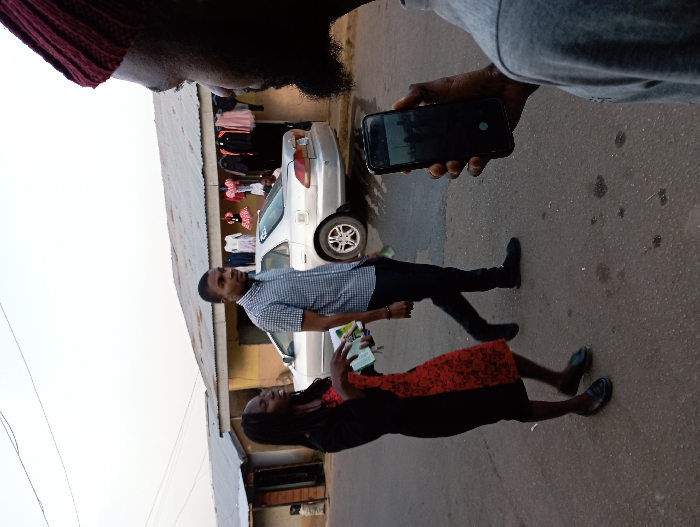 The image depicts a street scene on an unspecified street in Jos, Nigeria, under a hazy daytime sky. In the immediate foreground, to the right, a dark-skinned individual with a beard and a red knitted beanie is partially visible, wearing a grey shirt. This individual holds a black smartphone horizontally in their right hand, with the screen displaying a camera interface, indicating active recording or photography of the scene ahead. In the midground, from left to right: A dark-skinned female is visible, dressed in a black dress with a prominent red patterned section on the front, and black flat shoes. She holds multiple green and white leaflets or brochures in her left hand and appears to be speaking or gesturing towards the left, her mouth slightly open. To her right, a dark-skinned male walks past her. He wears a light blue and white checkered short-sleeved button-up shirt, dark trousers, and dark shoes. He carries a small green object, possibly currency or another leaflet, in his left hand. In the background, a silver four-door sedan car is parked on the side of the street, positioned behind the two midground figures. Behind the car and further to the right, a single-story building with a corrugated metal roof features various items of clothing, including dresses and tops, hanging on display, suggesting a roadside retail stall or shop. Another similar building with a corrugated roof is visible further to the left. The street surface is dark grey asphalt, showing some minor stains or marks.