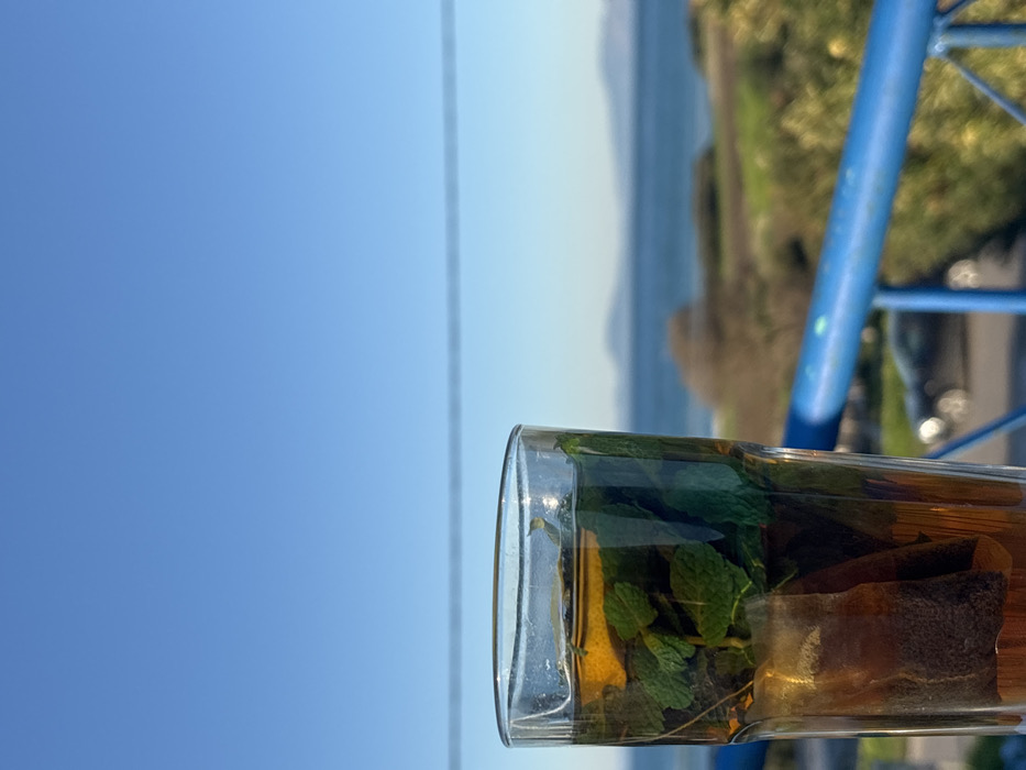 A glass of herbal tea, possibly mint, rests on a surface, juxtaposed against a bright blue sky and distant ocean