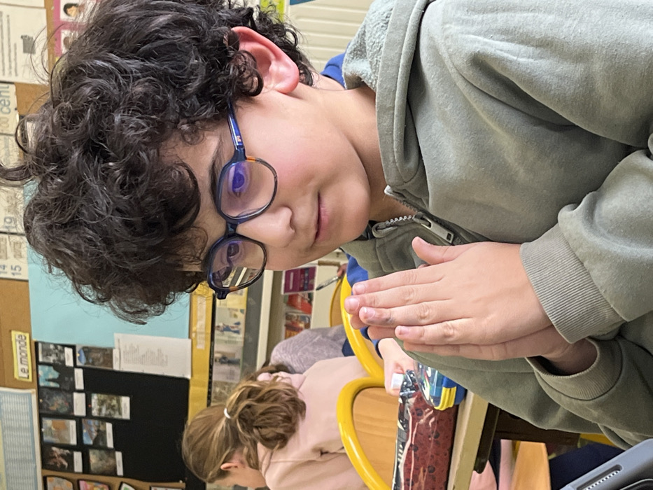 The image depicts an indoor scene within a classroom in La Fouillouse, France. A young male, approximately elementary school-aged, with dark, curly hair and dark-framed eyeglasses, is positioned in the foreground. He wears a light olive-green hooded zip-up sweatshirt. His hands are pressed together vertically in front of his torso, palms touching, with fingers pointing upwards. His gaze is directed slightly downward and to his right. Partially visible in the mid-ground, to the left, is a female student with light brown hair tied in a ponytail, wearing a light pink long-sleeved top, seated at a desk with a yellow chair back. A red and black patterned pencil case or bag is on the desk surface. The background features a classroom wall with a black bulletin board displaying multiple small rectangular images and a light blue sheet of paper. Above the bulletin board, a yellow strip is visible, with the French phrase "Le monde" and partial numbers "15", "19", and "100 cent" written above it on a lighter surface. Shelves containing books are visible further behind the students.