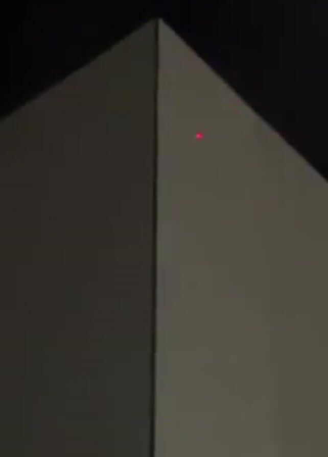 close-up of the corner of a building against a black background. The two sides of the building are different shades of grey. Brief flashes of light appear at the top of the corner.