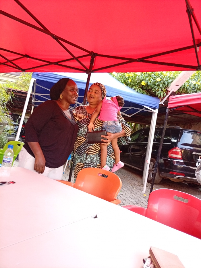 This image depicts an outdoor social gathering in Gwarinpa, Nigeria, under multiple canopies
