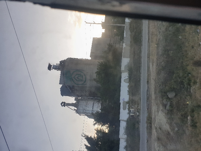 Two industrial concrete silos with green logos stand beside a road. The landscape appears dry and scrubby. A gray overcast sky serves as the backdrop. Wires and what seems to be part of a window frame are partially visible at the edges of the image, giving the impression of viewing the scene through a pane.