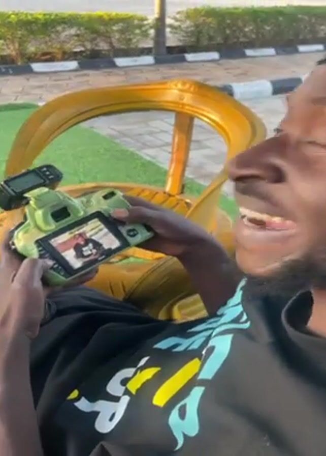 A man is sitting in a gold painted outdoor chair, looking at the LCD screen of a green camouflage patterned DSLR camera that is in his hands. He is smiling, apparently amused by something that he is seeing on the screen. He is wearing a black t-shirt, a black mesh baseball cap with a red element, and blue athletic pants. The man is dark-skinned with a short beard and a mustache. The chair is made of painted tires arranged to resemble a peacock. The scene is outside. There are sidewalks, shrubbery, and palm trees visible in the background.