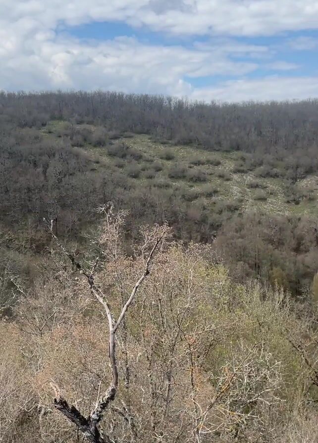 view of a forest from a high vantage point. The forest appears to be in early spring as most trees are still bare, with only a few showing early signs of budding. The landscape is hilly. In the distance, a small village can be seen nestled among the trees. The sky is partly cloudy, with patches of blue visible between the clouds. The camera pans slowly across the scene, offering a wide view of the forested area.