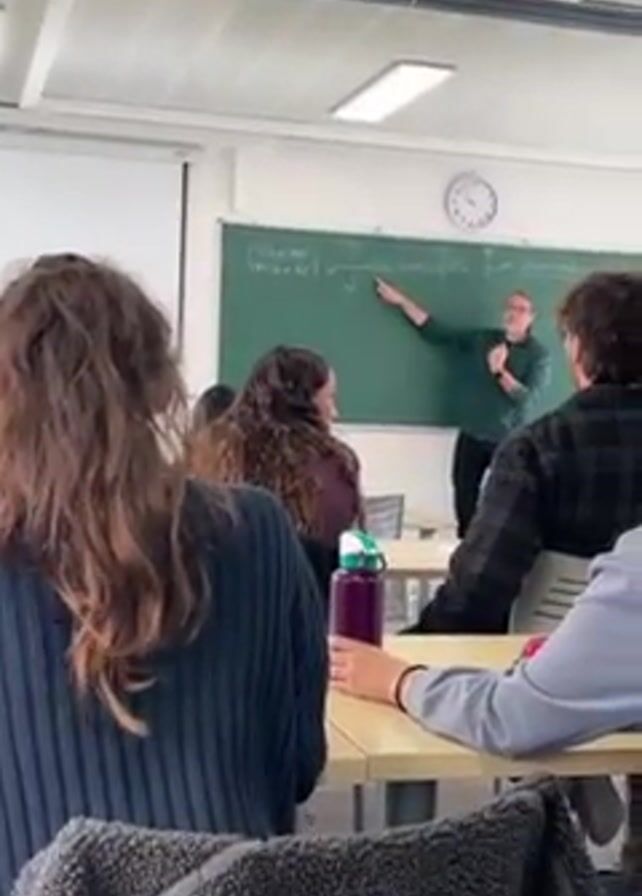 The video depicts a classroom setting. A teacher is standing in front of a green chalkboard, explaining a mathematical equation while pointing at the board. The classroom is filled with students sitting at tables. The camera is positioned behind a group of students, providing a view of the teacher and some of the other students in the room. There is a projector screen on the left side of the room. The room is well-lit with overhead fluorescent lights. There's a clock on the wall. Some students are looking at the teacher, and one has a purple water bottle on the table.