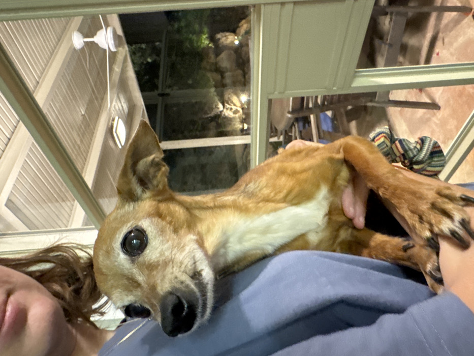 A close-up shot features a tan dog resting on a person's chest. The dog has large, expressive eyes and one ear standing up. Part of a woman's face and hair are visible on the left. The person is wearing a light purple shirt. Background includes a screened-in porch area with a ceiling fan, foliage visible through the screen, and glimpses of outdoor furniture. The dog's paws are prominently displayed near the person's hand.