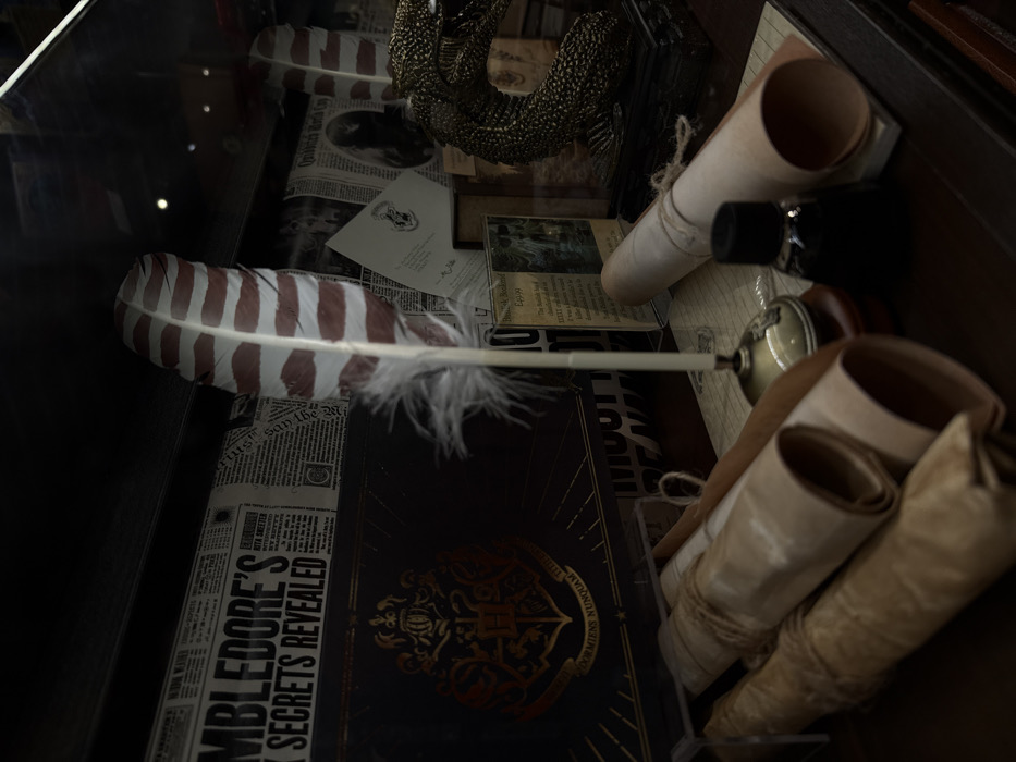A collector's display features a quill pen with red and white stripes nestled in a quill stand near rolled parchment, an inkwell, and a golden dragon claw