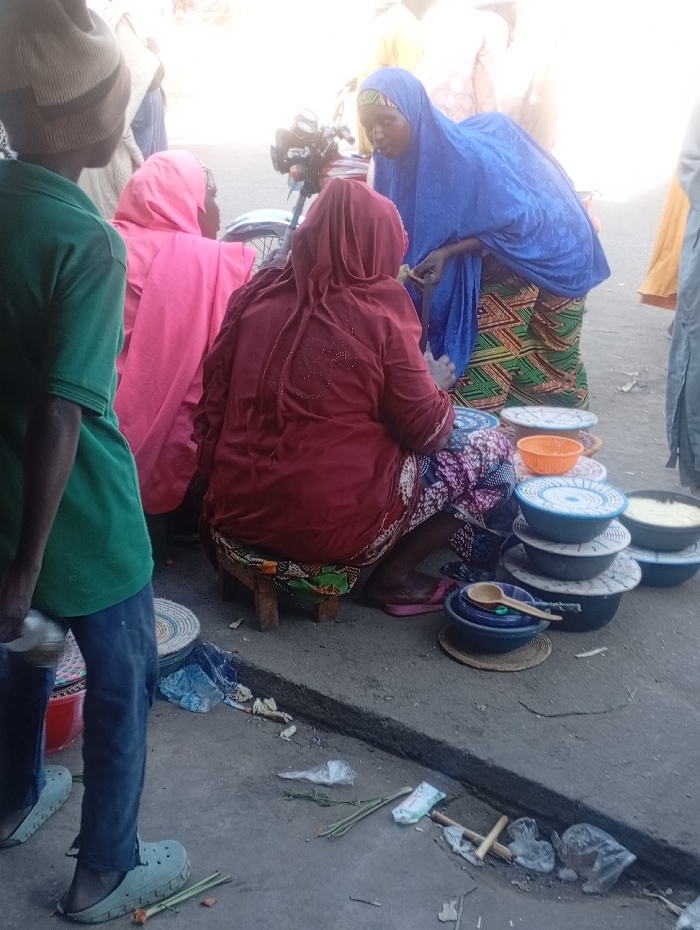 A street scene features several individuals, including women in colorful head coverings. One woman in blue leans over a seated woman in red, likely engaged in commerce, surrounded by bowls and containers of food or goods. A man in green stands nearby. Trash litters the ground near a shallow trench running along the pavement, adding to the chaotic atmosphere. A motorcycle is parked in the background.