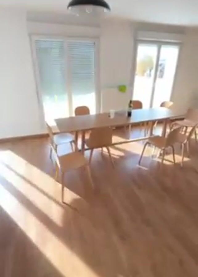 person opening a door to reveal a bright, sparsely furnished dining room. Sunlight streams through the windows and a sliding glass door. The room has a light wood floor and white walls. A long table with several wooden chairs sits in the center of the room. A glimpse of a kitchen area is visible, featuring light wood cabinets and stainless steel appliances. The camera then pans to show a hallway and two refrigerators.