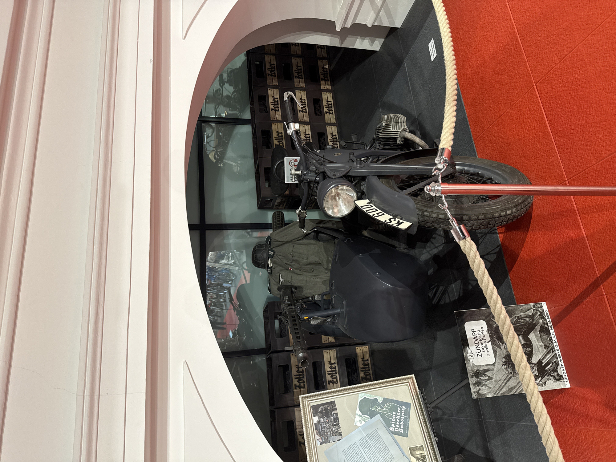 A static museum exhibit is depicted indoors, situated under a light-colored arched entryway. The primary subject is a dark gray vintage Zündapp KS 600 military motorcycle with an attached sidecar, identifiable by the "KS 600" plate on the front fender. A heavy machine gun, consistent with an MG 42, is mounted to the front of the sidecar. Behind the sidecar, a dark green military jacket with an eagle insignia, a helmet, and a green military backpack are displayed. The exhibit area, floored with dark gray tiles, is demarcated from the viewer's red tiled floor by a tan rope barrier supported by chrome stanchions. To the left, a framed display features historical photographs and a German propaganda poster stating "Spione Verräter Saboteure" (Spies Traitors Saboteurs). A book titled "ZÜNDAPP zuverlässig an allen Fronten" lies on the floor, partially under the rope. In the background, behind the motorcycle, multiple wooden crates bearing the label "Zoller" are stacked. A large reflective surface behind these crates shows blurred reflections of another interior space, possibly containing additional exhibits or vehicles. This exhibit is located in Sigmaringen, Germany, likely within the Museum im Alten Zeughaus, which houses historical collections.