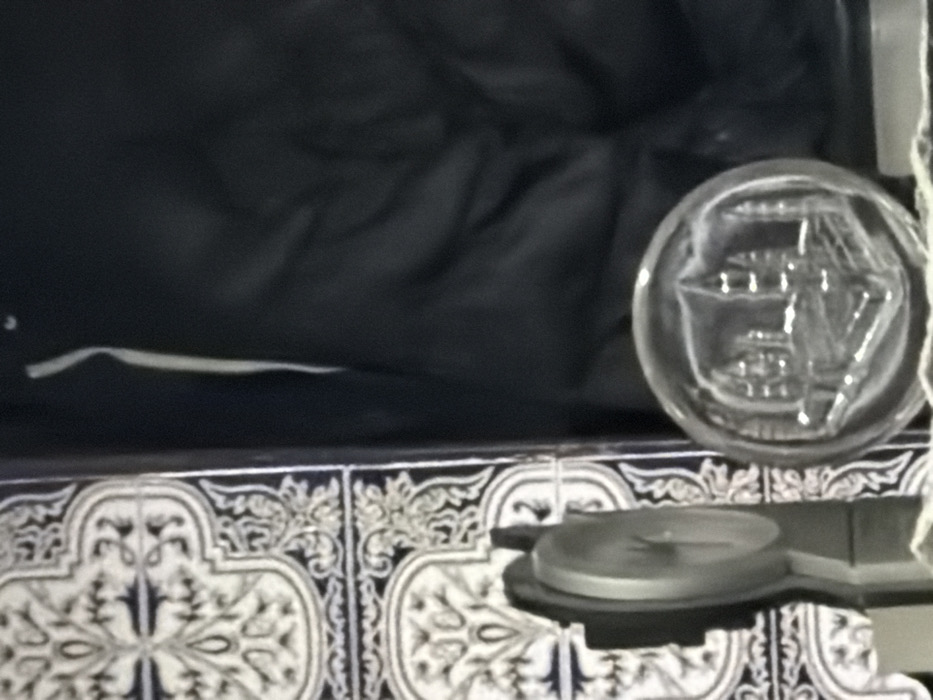 A dark, possibly crumpled fabric sits behind a decorative tiled surface. On the tiles, a clear, round glass object etched with a ship design reflects light. Next to it, a small, gray circular object rests on a black stand, possibly a soap dish or similar bathroom accessory. The tiles have a black and white intricate pattern.