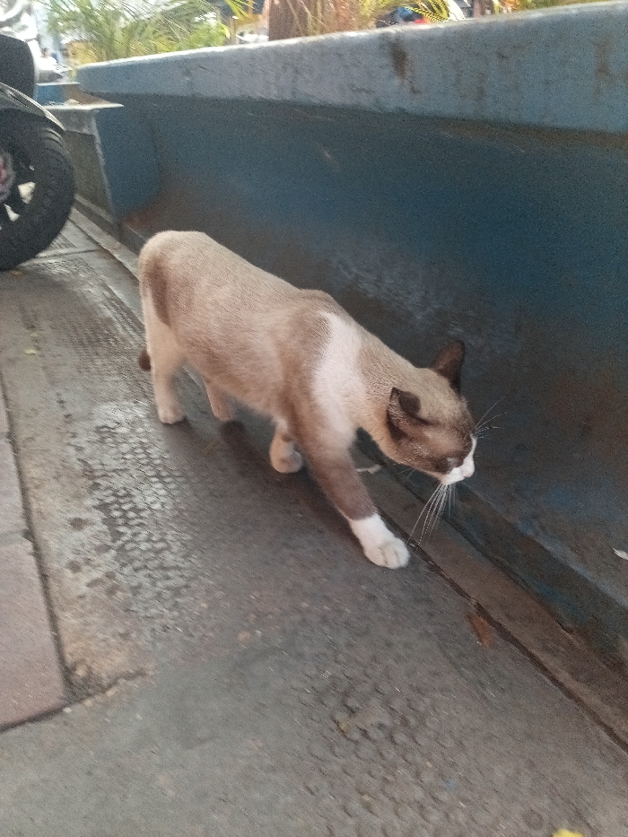 - "A lean cat, light tan with dark brown points on its face, ears, and lower legs, and white paws, walks left-to-right on a textured gray pavement surface" by FM-LkkdS2, licensed under CC BY 4.0