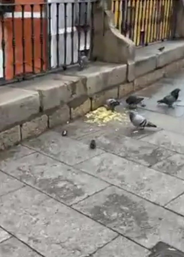group of pigeons and a small brown bird feeding on scattered yellow food items on a stone-paved surface next to a low stone wall. Behind the wall is a black metal fence and colorful buildings. Some birds are actively pecking at the food, while others are standing nearby. The pavement is gray and the overall scene is typical of an urban environment where birds gather to feed.