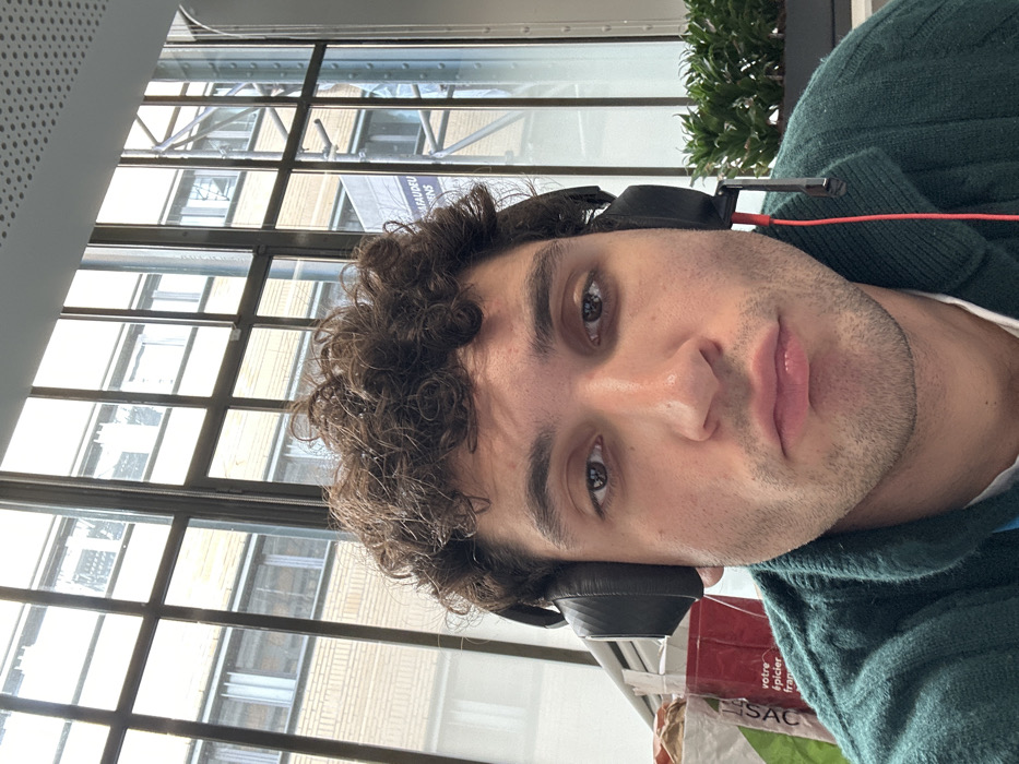 A young adult male is depicted in a medium shot selfie, centered and looking directly at the camera with a neutral expression and slightly pursed lips