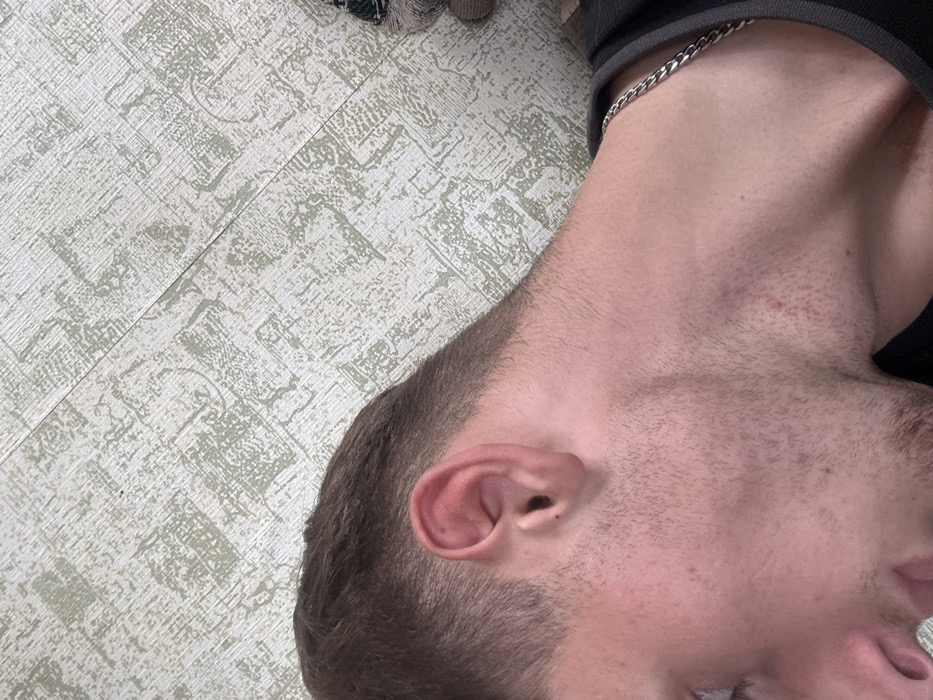 A close-up, angled photograph taken in the city of Durgena, Georgia, depicts the left side of a male individual's head, neck, and upper chest
