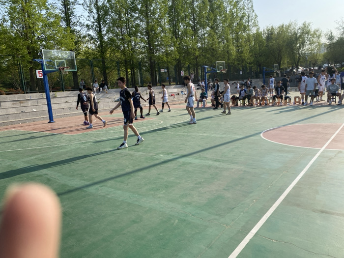 basketball court in Qingdao, China, at the coordinates 36.004 latitude and 120.115 longitude. The court is green with white lines and a red semi-circle around the basket. A basketball hoop with a net is at the left side of the image, and there is another one at the right side. The court is empty except for a group of young men playing basketball. The players are wearing black and white basketball uniforms. There are several people sitting on benches around the court watching the game. The background is a green grassy area with some trees. There are several buildings in the distance. The image was taken during the daytime on a clear sunny day.