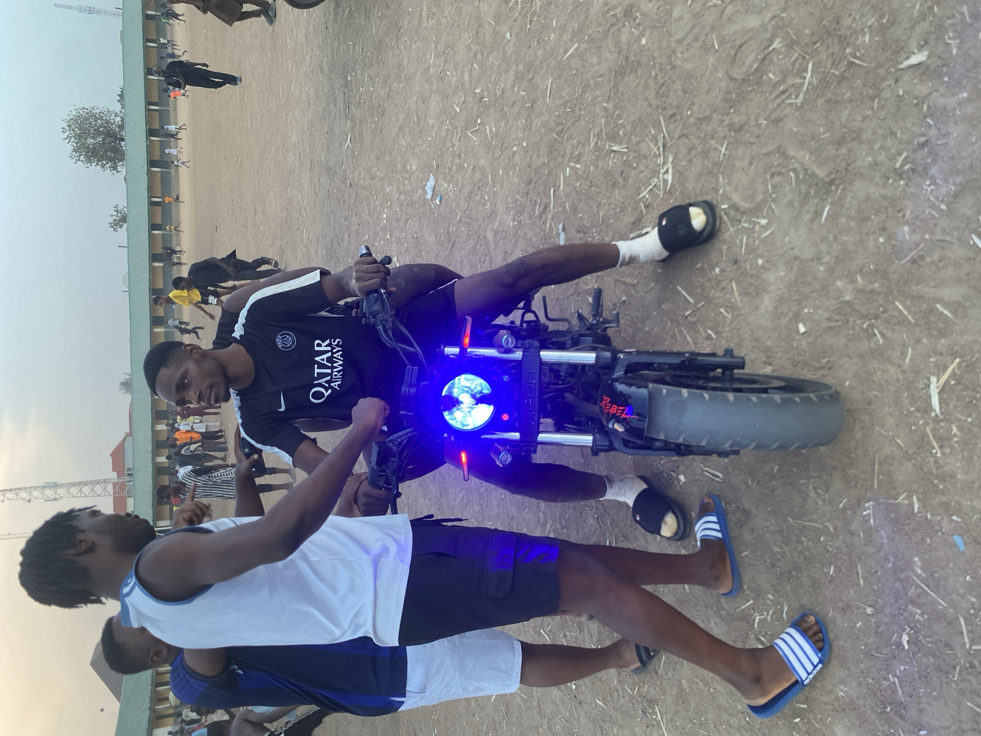 The image depicts two individuals interacting with a motorcycle in Barden Yana, Nigeria. One person sits on the motorcycle, which features a prominent blue headlight and the word "REBEL" on its side. The other individual stands beside the motorcycle, seemingly engaged in conversation with the person on the bike. The scene takes place outdoors on a dirt-covered surface, possibly a field. In the background, a building structure with multiple people can be seen, suggesting a gathering or event. The sky appears hazy, indicating either a cloudy day or the presence of dust in the atmosphere. Both individuals are wearing sandals.