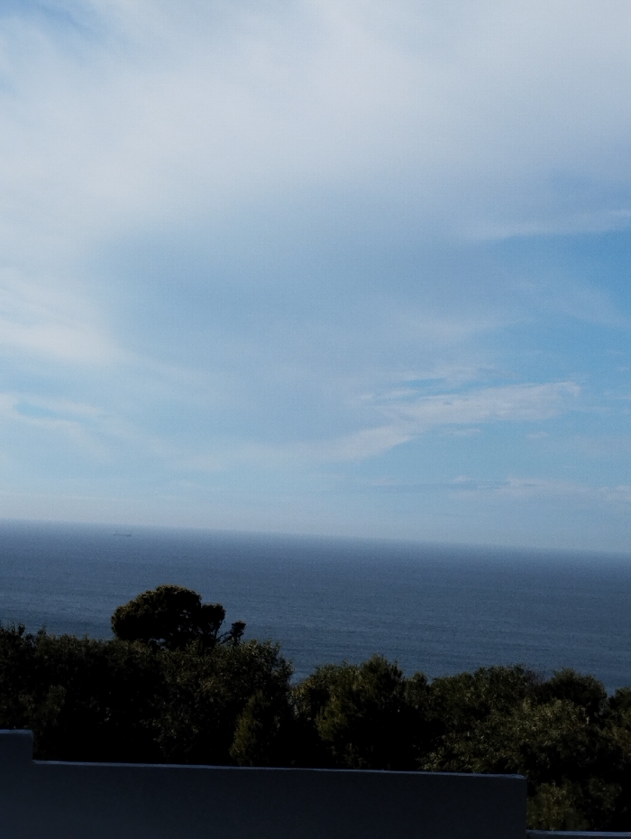 This image captures a coastal vista from an elevated perspective in Tangier, Morocco. The lower portion of the frame features a light gray, horizontal wall or railing, serving as the immediate foreground. Directly beyond this barrier, a dense band of dark green vegetation, composed of trees and shrubs, extends across the midground. The background is dominated by a calm, deep blue-gray sea that stretches to the horizon. A single, dark-colored vessel is faintly discernible on the distant horizon line within the upper-left quadrant of the sea. The sky occupies the upper two-thirds of the image, displaying a light blue hue with scattered, wispy white clouds. No individuals, explicit actions, or direct interactions are present. The scene depicts an outdoor, natural coastal environment under daylight conditions.