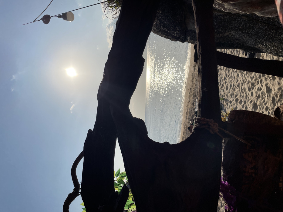The scene depicts a sunny coastal environment in Tambon Ko Tao, Thailand, viewed through a dark, gnarled wooden framework that forms an irregular arch in the foreground. The sky is clear and light blue, occupied by the bright, overhead sun positioned in the upper right quadrant, casting intense glare onto the water. The ocean, visible through the arch, is calm and displays a path of sparkling sunlight reflecting off its surface, extending towards the horizon. A sandy beach, light in color and textured with small undulations, separates the wooden structure from the water. On this beach, to the left of the sun's reflection, one individual is visible, lying or reclining on the sand. The dominant wooden framework, dark in silhouette, appears organic and possibly sculpted, with a visible segment of knotted light-colored rope tied to its lower left portion. Subtle green foliage is present behind the framework on the left, and a hint of purple/pink material is near the rope on the lower left. To the right of the sandy beach and framed by the wood, a dark, large rock formation is partially visible. In the upper right corner, an outdoor light fixture consisting of a white, inverted bulb suspended by a wire from a pole extends into the frame. The overall impression is a bright, clear day.