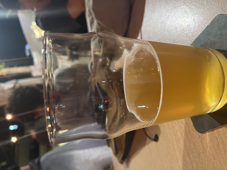 - "The image displays a clear glass, approximately half-full with a translucent, light amber liquid, likely beer, topped by a thin white foam layer and exhibiting residual lacing on its inner walls" by FM-CKvQF3, licensed under CC BY 4.0