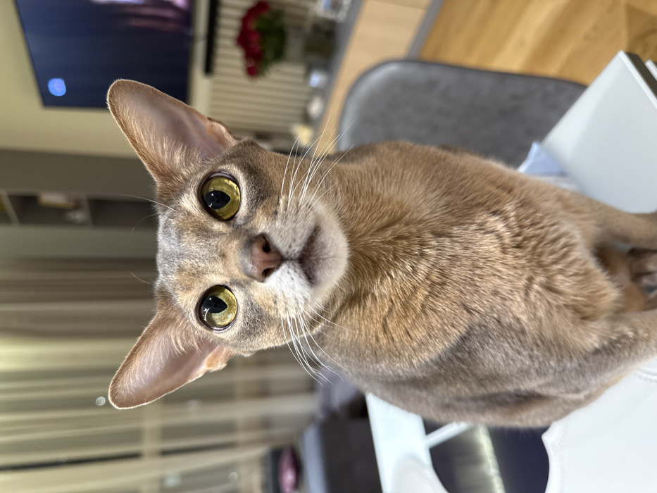 A close-up, slightly angled view shows a ruddy Abyssinian cat