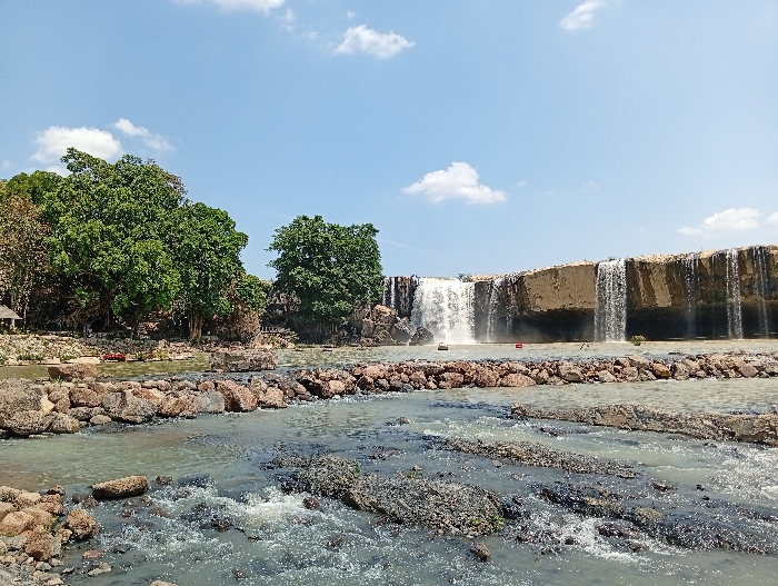 - "The image presents a wide view of a waterfall and river landscape situated in Đức Lập, Vietnam, under a clear blue sky adorned with scattered white cumulus clouds" by FM-kSYmj1, licensed under CC BY 4.0
