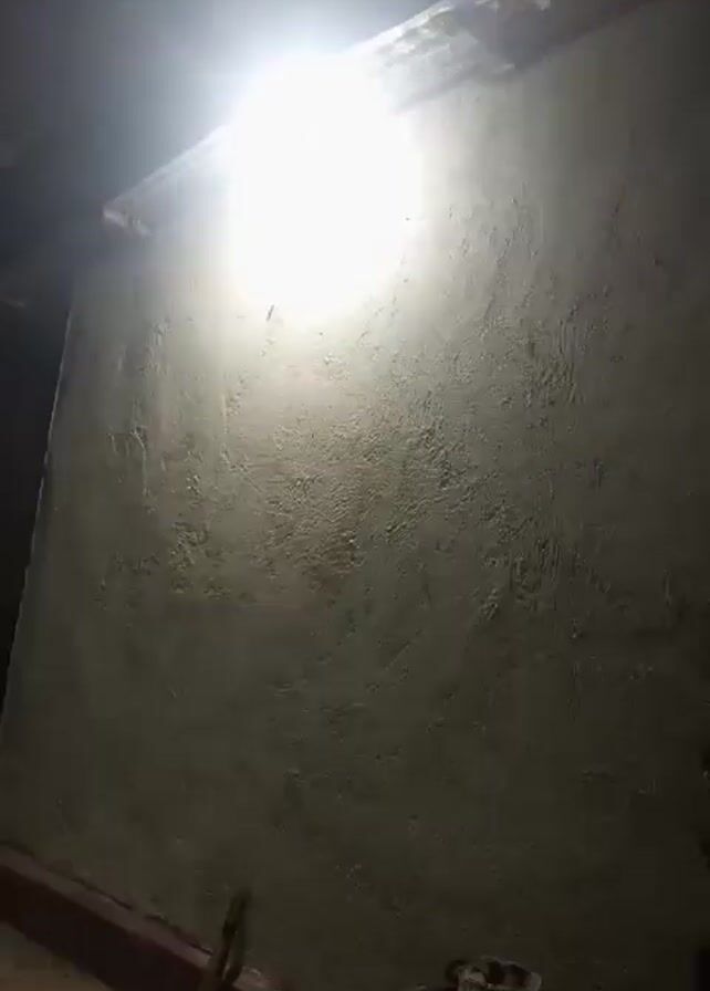 wall illuminated by a bright light. The wall is textured and painted in a neutral color. Below the wall, there is a concrete or paved ground. There are a couple of objects placed on the ground next to the wall, including a tire with a container on top of it and a long thin object leaning against the wall. The light source is positioned above and in front of the wall, casting a strong glare. The overall setting appears to be outdoors at night.