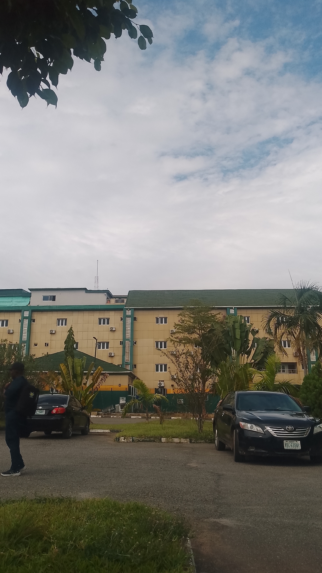 daytime view of the Immigration Quarters in Nigeria. A multi-story building with a yellow facade and a green roof is centrally positioned in the background. There are numerous windows and air conditioning units visible on the building's exterior. In the foreground, two black cars are parked on a paved surface, and a person is standing near the car on the left side of the frame. Trees and other greenery are scattered around the parking area, and the sky is overcast.