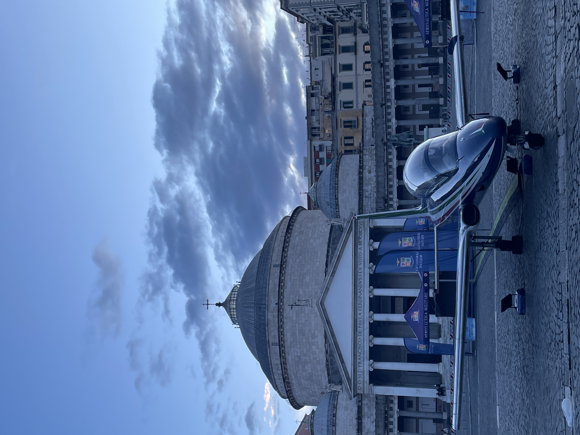 - "A small, dark blue jet aircraft, adorned with white and green stripes reminiscent of the Italian flag, is parked on a cobblestone plaza in the foreground" by FM-4OCh93, licensed under CC BY 4.0