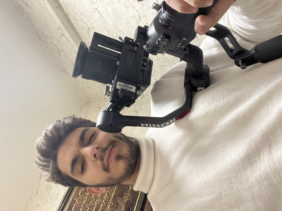 A young adult male, characterized by dark hair, a beard, and a mustache, is depicted in an indoor setting within Al-Qanawat Municipality, Syria. He wears a white turtleneck sweater and is holding a black DJI Ronin handheld gimbal stabilizer. A digital camera with a lens is mounted onto the gimbal, positioned in front of him, indicating a self-captured image or video. His right hand secures the gimbal's handle. The background features light-toned, textured wallpaper and a dark-framed piece of Arabic calligraphy on the left, partially displaying "بسم الله الرحمن الرحيم".