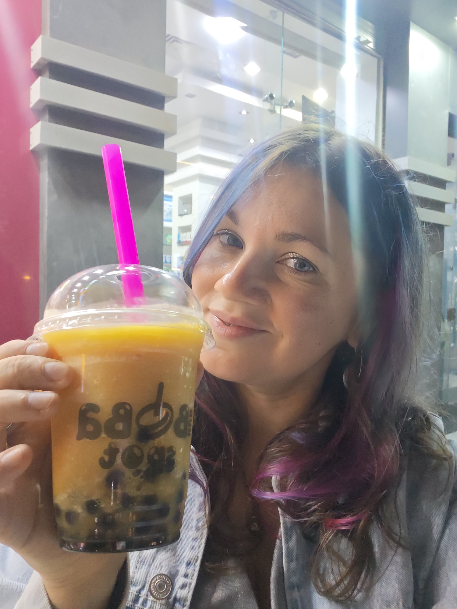 A woman stands indoors in front of a brightly lit window. She holds a large, clear plastic cup of boba tea with a pink straw, the cup labeled "Boba Joe's". She smiles and looks at the camera. The background shows a building with bright white pillars. The location is Hurghada, Egypt. She has dyed blue and pink streaks in her brown hair. She wears a light blue denim jacket.
