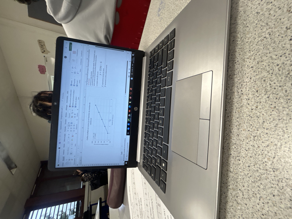 The image depicts an indoor scene within a classroom located in the city of Schiltigheim, France. A silver HP laptop is positioned centrally on a speckled light-colored desk, its screen displaying a Microsoft Excel spreadsheet. The screen content includes a line graph titled "Chiffre d'affaire en euros (y) en fonction du nombre de clients (x)" and the equation "y = 23.4x - 6". To the left of the laptop, a paper document with numerical data is partially visible, alongside a dark brown pencil case. Behind the laptop, a person with dark, possibly braided hair is seated, with only their head and upper back visible. To their right, another individual wearing a light-colored hoodie is partially visible next to a red object. In the left background, a third person is visible near a window fitted with horizontal blinds. The classroom features white walls, overhead lighting, and a whiteboard or poster board displaying text, including "WATT," and a red graphic on the back wall.
