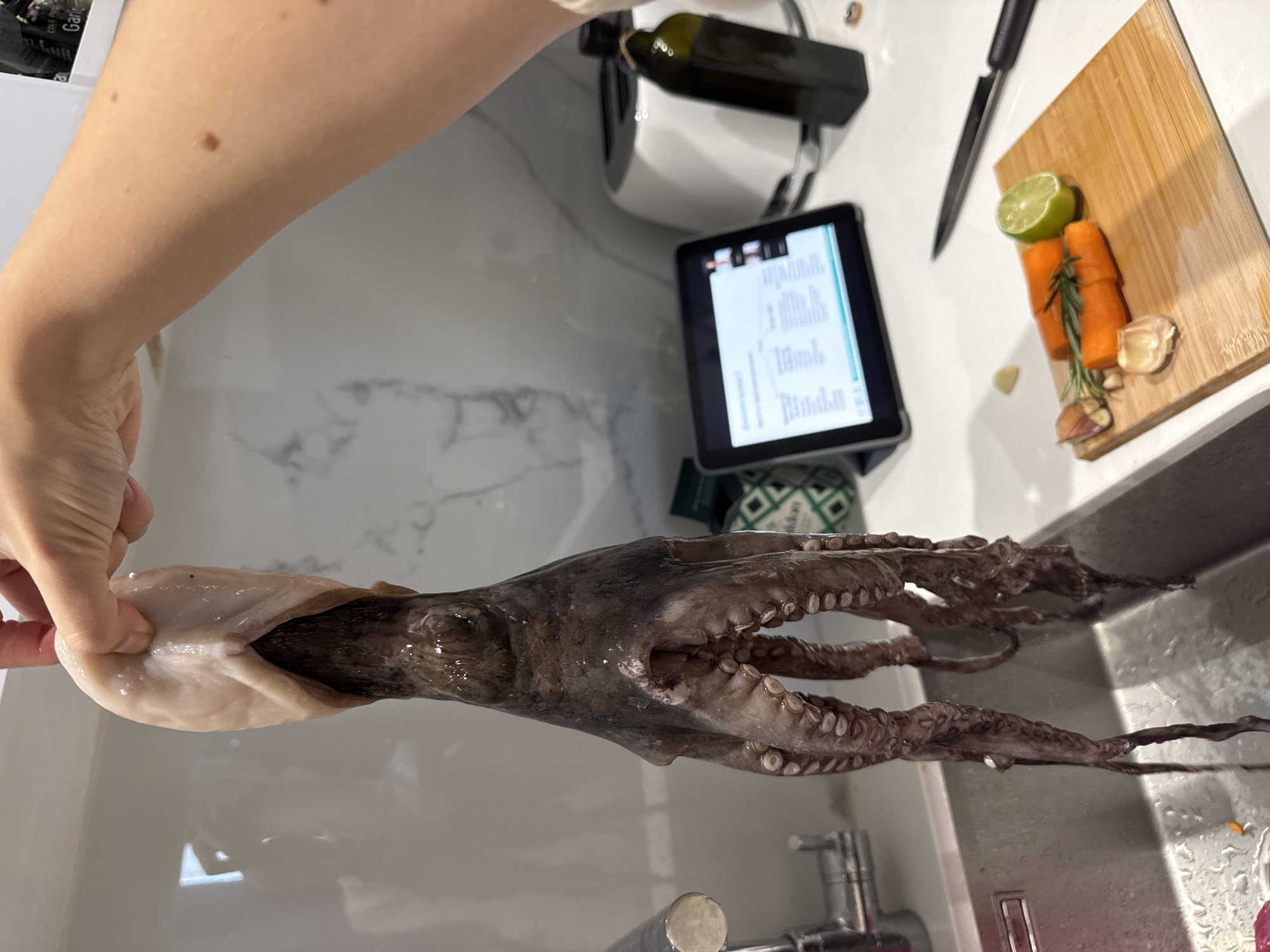 A person's arm and hand hold a raw octopus over a stainless steel sink. The octopus is mostly gray and brown, with visible tentacles and suckers. The person's hand is inside the octopus' mantle, exposing the interior. In the background, on a white countertop, are various kitchen items, including an olive oil bottle, a tablet displaying a recipe, a knife, and a cutting board with a lime, carrots, garlic, and rosemary. The scene appears to be a kitchen environment. The image does not provide information about the location in Livadia Larnakas, Cyprus.