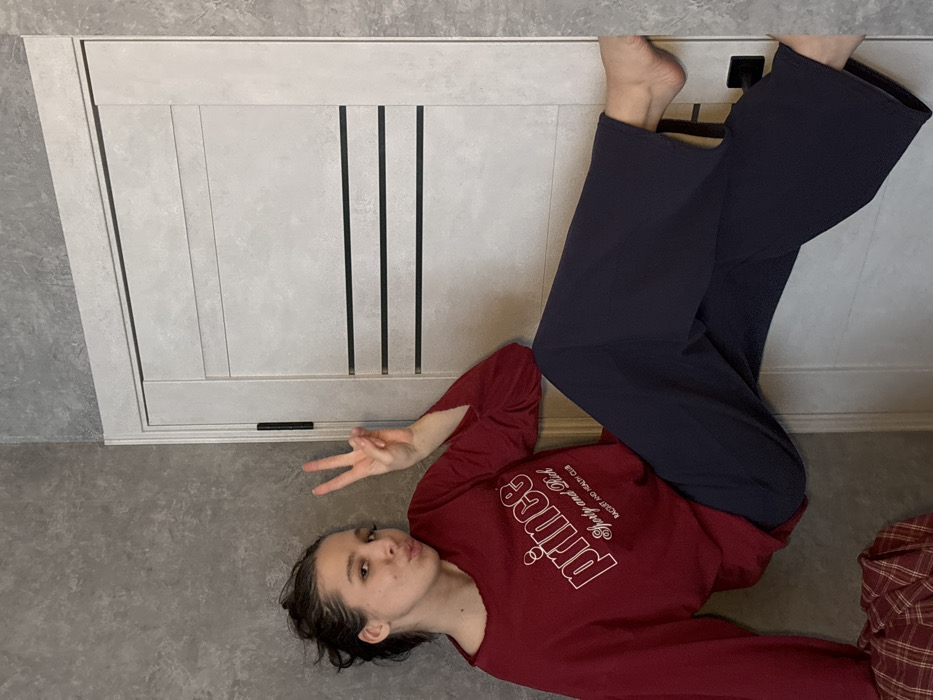 In an interior setting in Tliustenkhabl', Russia, a young female subject is depicted in a diagonal, suspended-like pose against a wall and door. The subject, with dark hair loosely tied back, wears a maroon long-sleeved top with "prince Sporty and Rich RACQUET AND HEALTH CLUB" printed in white on the front, and dark blue wide-leg trousers. Her feet are bare. She faces the viewer with pursed lips and raises her right hand in a peace sign. Her body extends from the lower-left to the right-center of the frame, with her bare right foot positioned against the door. The background features a textured, light gray wall on the left and a light gray interior door on the right. The door has three horizontal dark strips and a black handle on its right side. A section of plaid fabric is visible in the lower-left corner.