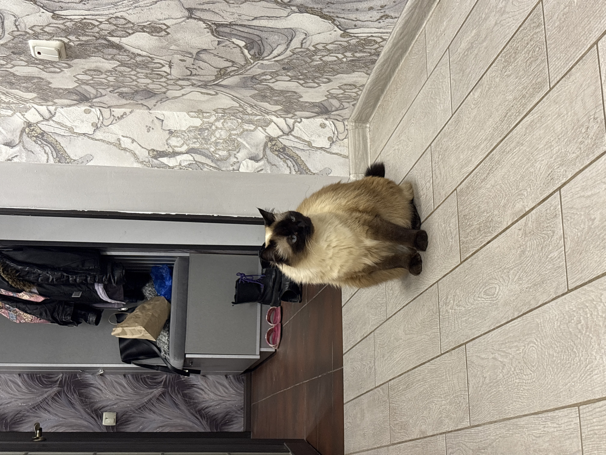 A medium shot shows a cream and brown Siamese cat lying on a floor of beige wood-patterned tiles, adjacent to a brown tiled area and a built-in closet or storage space in what appears to be a domestic interior