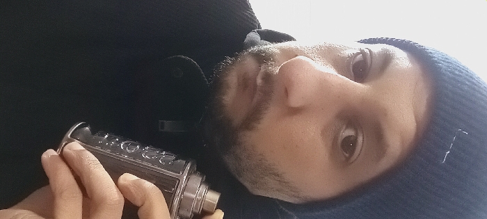 A person wearing a dark blue beanie and a dark jacket is holding a silver BOSS-branded cologne bottle. The person has a beard and is looking directly at the camera with a serious expression. The photo appears to be a selfie taken at close range. The lighting is soft and diffused, creating a subtle glow on the person's face.