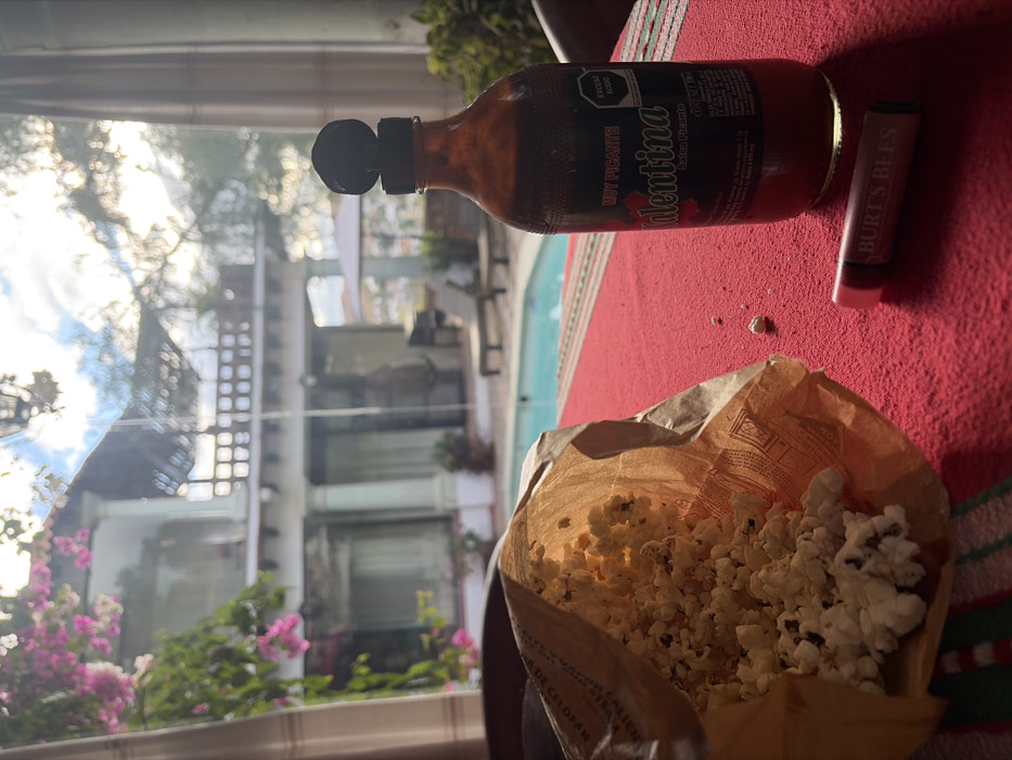 A bottle of Valentina hot sauce and Burt's Bees lip balm sit on a red tablecloth. A partially filled bag of popcorn is prominently displayed in the foreground. Outside the window, blurred buildings, trees with pink flowers, and a swimming pool are visible. The scene appears to be indoors, with the outdoor view reflected in the window.