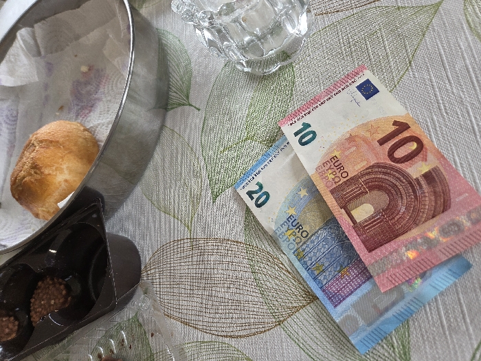On a table in Cherkovitsa, Bulgaria, a light-colored tablecloth patterned with green and brown leaves serves as the background. In the foreground, three Euro banknotes are fanned out: a blue and yellow 20 Euro note, a red and orange 10 Euro note, and a partially visible blue and gray 5 Euro note underneath the 10 Euro note. To the right of the banknotes, a small, clear glass dish with a scalloped edge and internal divisions is present. In the upper left quadrant of the image, a dark brown plastic tray with multiple compartments is visible, containing two small, round, brown confections with textured surfaces. Adjacent to this tray, a silver-colored, oval metal bowl lined with a white paper towel holds a single, golden-brown bread roll. No individuals are present.