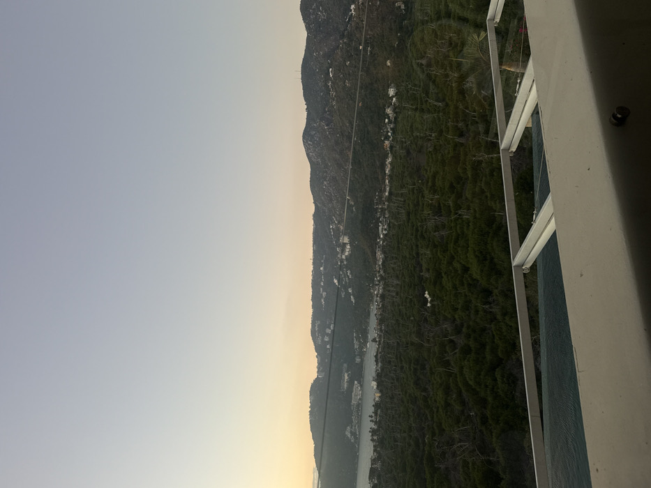 A mountain coastline with dense greenery descends into the water under a hazy sky. Buildings and a road dot the mountainside. A structure with white railings partially obscures the view on the right, suggesting the photo was taken from an elevated position. The overall scene evokes a tranquil and scenic coastal landscape.