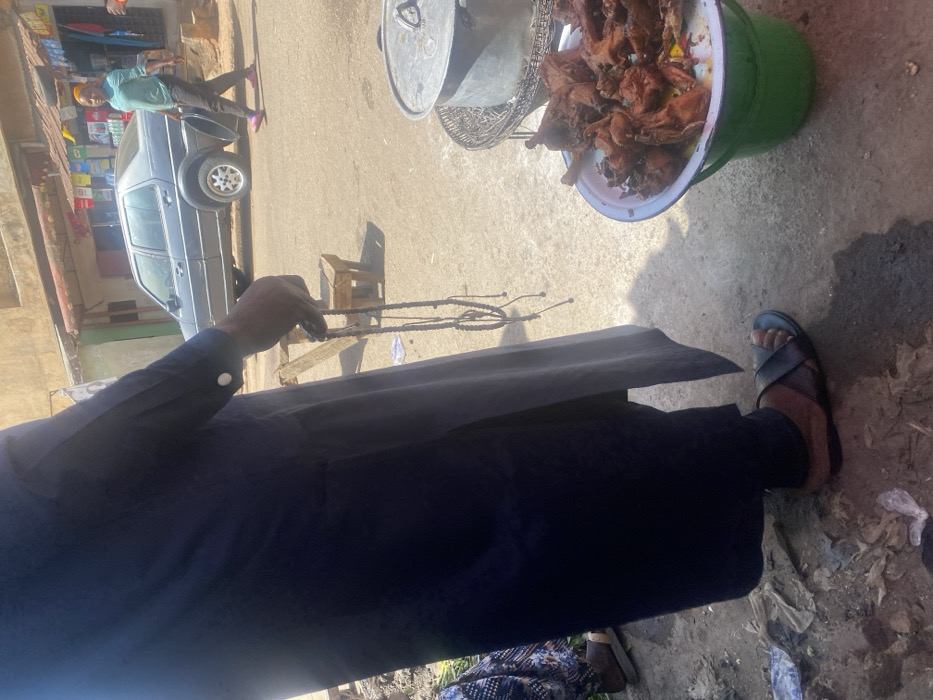 The image depicts an outdoor street scene, likely in a commercial area within Jos, Nigeria. In the immediate foreground, to the left, a person is partially visible, wearing a dark blue full-length garment and dark sandals, holding multiple strands of dark, beaded items, possibly prayer beads, in their right hand. A portion of another individual's leg and foot, clad in patterned fabric and brown sandals, is visible further left. The ground in the foreground is unpaved, dusty, and contains scattered debris including plastic. To the right foreground, a large white enamel basin with a green rim, supported by a green bucket, holds a quantity of deep-fried poultry pieces. Behind this, a large, lidded metal pot rests on a wire rack, suggesting food preparation or warming. In the midground, a paved or unpaved street is visible. A dark grey sedan, appearing to be a Volkswagen Jetta, is parked facing left along the street. Further down the street, a male figure wearing a light blue-green long-sleeved shirt, dark trousers, and pink footwear walks from right to left, carrying a dark, circular object. The background features buildings with light-colored, weathered facades, housing various small shops or stalls with goods displayed and awnings. Strong sunlight casts distinct shadows, indicating a clear day. The specific location within Jos cannot be determined from the visual evidence.