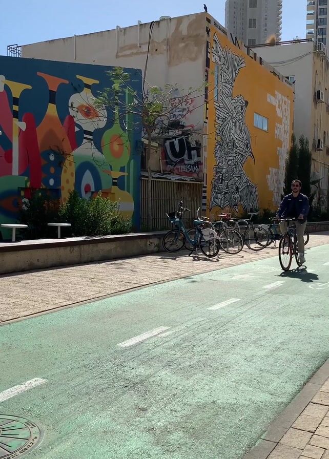 On a sunny day, two individuals on bicycles ride along a green-painted bike path in a city. The path is flanked by buildings adorned with colorful murals. Several parked bicycles lean against a fence.