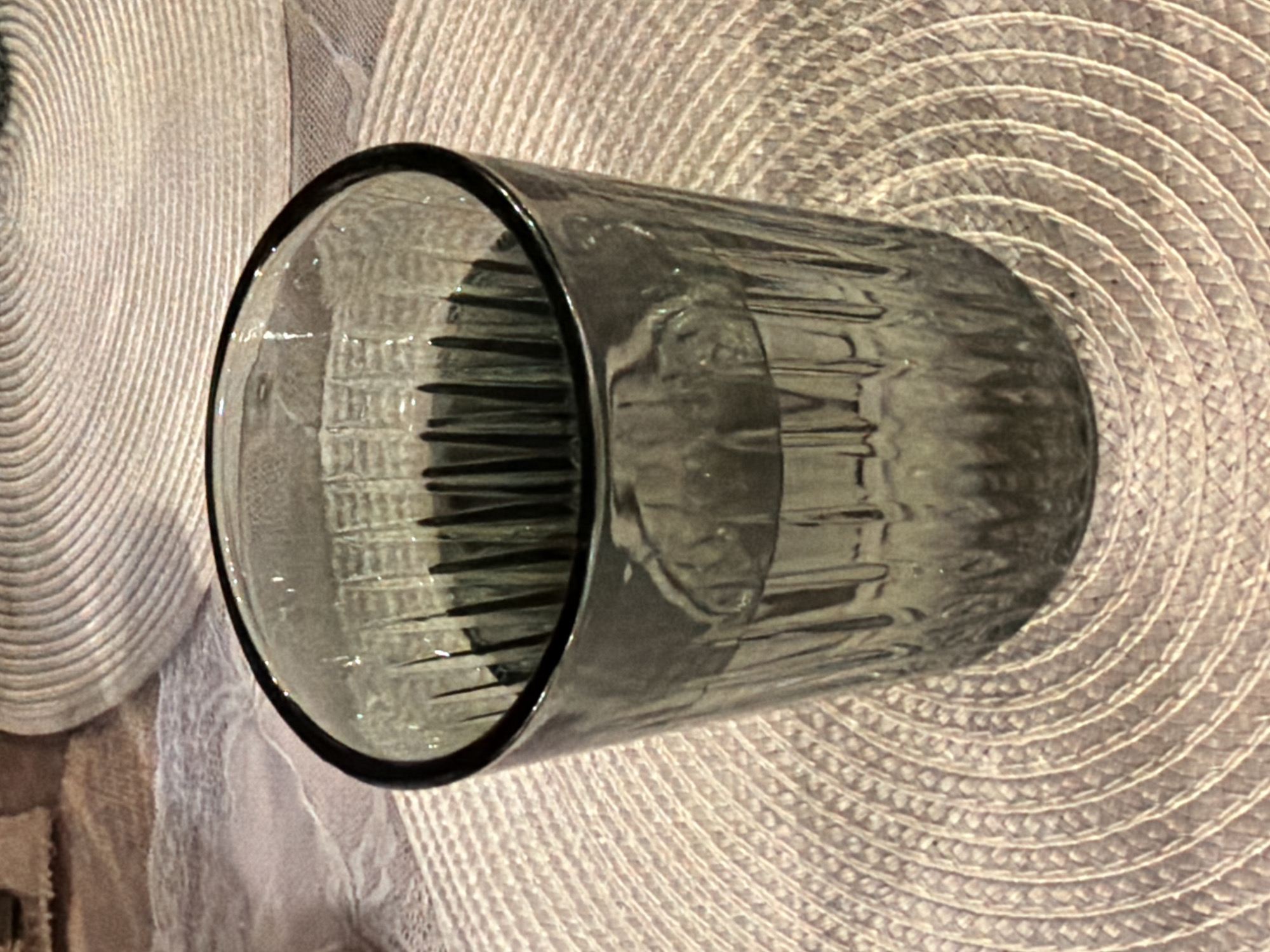 The image displays an indoor still life, consisting primarily of a dark grey, fluted glass tumbler containing clear liquid, positioned centrally on a light beige, woven circular placemat
