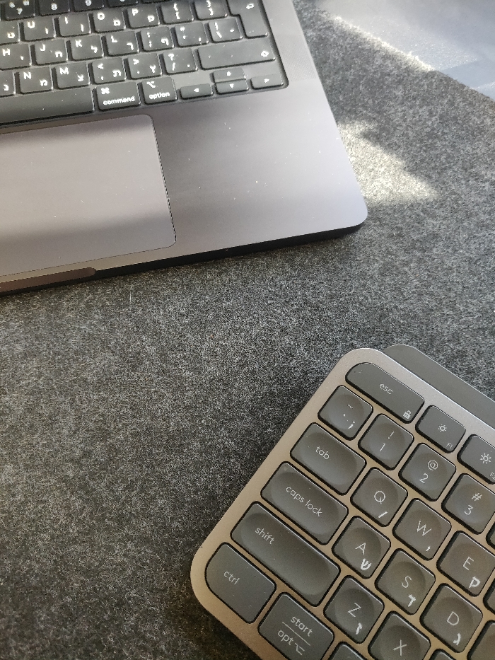 The scene depicts a desktop setup located in Unknown, Unknown. A dark grey laptop computer, displaying a keyboard with English and Hebrew characters and a trackpad, occupies the upper left quadrant of the frame. An external keyboard, featuring a light grey base and dark grey keys with dual English and Hebrew legends (including "esc", "tab", "caps lock", "shift", "ctrl", "start", "opt", "Q", "W", "E", "A", "S", "D", "Z", "X"), is positioned in the lower right. Both devices rest on a dark grey, textured, felt-like surface. A diagonal band of direct illumination, consistent with sunlight, falls across the upper right portion of the felt surface and the upper right edge of the laptop. No individuals are present, and no actions or interactions are depicted.