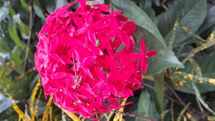 An extreme close-up photograph taken in Keudealue Ie Puteh, Indonesia, depicts a dense, hemispherical cluster of numerous small, bright fuchsia-red flowers. Each individual flower typically features four distinct petals. The flower cluster is centrally positioned, occupying a significant portion of the frame. Directly beneath the main flower cluster, a single broad, dark green leaf is visible, acting as a base or support for a portion of the flowers. The immediate background and surrounding areas consist of blurred foliage, primarily comprising various shades of green leaves. Some background leaves exhibit distinct yellow variegation or spots, indicating the presence of other plant species. The lighting is consistent with natural ambient light, illuminating the vibrant red hue of the flowers without harsh shadows. No individuals, animals, or artificial structures are present in the image.