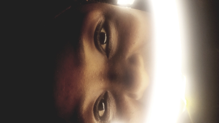 A close-up, low-angle portrait depicts the upper portion of a singular individual's face, identified as being located in Narayi, Nigeria. The subject exhibits dark skin, with the eyes and the bridge of the nose centrally visible. Both eyes are open, with pupils directed towards the viewer, reflecting a significant light source. The upper facial region, including the forehead and hair, is cast in deep shadow and merges with a dark background. A powerful, unidentifiable white light source is positioned directly below the subject's nose, illuminating the face from beneath and creating an intense glare that obscures the lower half of the face and the immediate foreground. No other individuals or objects are discernible within the frame. The interaction is a direct gaze from the subject towards the camera.