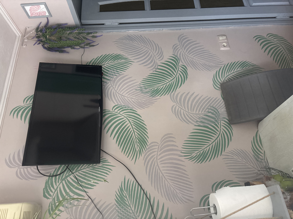 The image depicts an interior room in a residence located in Rostov-on-Don, Russia. The walls are painted a light beige and feature a recurring stencil pattern of stylized palm fronds in alternating shades of green and light grey. In the upper left, a light-colored air conditioning unit is mounted high on the wall. Centered on the upper half of the wall is a black Samsung flat-screen television, mounted with visible power and data cables trailing downwards. To the right of the television, a decorative artificial plant with green foliage and purple flower-like accents hangs from a white hook. Adjacent to the hanging plant, a small framed picture with a pink floral motif is affixed to the wall. The right side of the image reveals a light blue/grey doorframe with a partially visible door, featuring two glass panes, slightly ajar. Below the hanging plant and to the left of the doorframe, a white double electrical outlet is visible on the wall. In the lower portion of the image, a light-colored surface, possibly a table or countertop, extends from the left. Upon this surface, a white roll of paper towels is secured on a silver-colored holder with a visible rope component. To its right, a portion of a metal wire basket or rack is visible, containing indistinct items. The upper backrest of a grey chair is positioned against the wall in the lower right quadrant. White molding runs along the top perimeter of the walls where they meet the ceiling. No individuals are present in the scene.