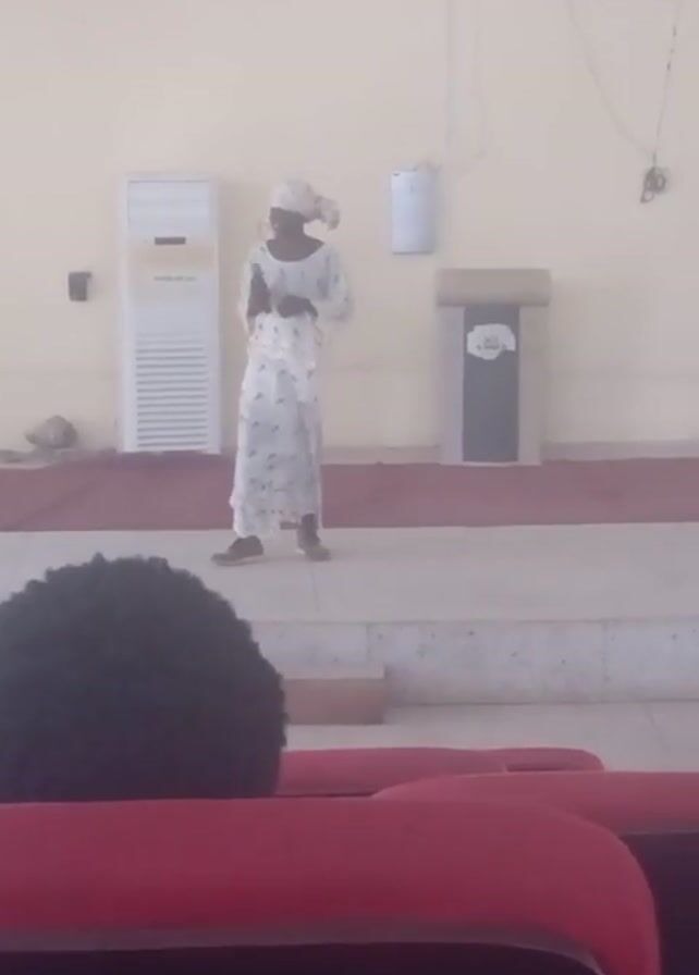 Here's a forensic description of the video: A woman stands on a slightly elevated stage in what appears to be an auditorium. She is wearing a long, patterned dress with a matching head covering and holds a microphone to her mouth. The background includes a large white air conditioner, a wall-mounted dispenser, and a simple podium. Seating, characterized by red upholstered chairs, is visible in the foreground, occupied by at least one individual with dark, curly hair. The lighting is somewhat dim and diffuse. A flag is visible hanging on the wall, presumably of the country where the video was taken.