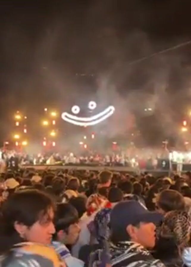 concert at night, with a large crowd of people in front of a stage. There is a large, illuminated smiley face above the stage. The camera focuses on the DJ, who is wearing a white beanie and a plaid scarf. The crowd appears to be enjoying the music.