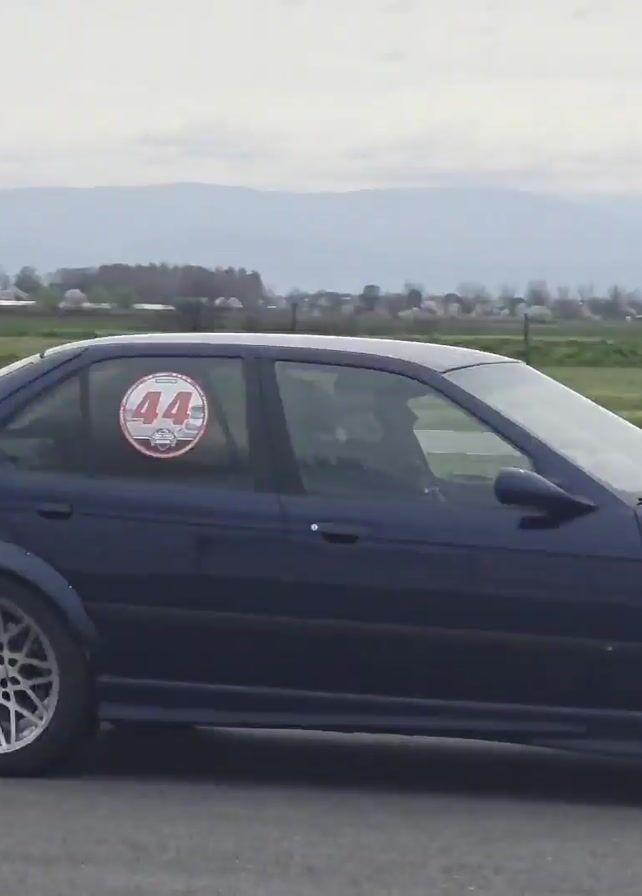 dark blue BMW racing on a paved racetrack. The car passes by the camera, and then the camera follows it as it drives away. There is a sign in the background that says "MAFRA cosmetics for your car". In the final shot, a man's head is visible in the foreground as he watches the car drive away. The sky is overcast, and there are trees and mountains in the distance.
